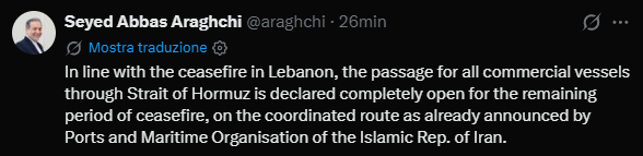 Il traffico marittimo commerciale attraverso lo Stretto di Hormuz sarà pienamente consentito per tutta la durata residua del cessate il fuoco in Libano. Lo ha annunciato il ministro degli Esteri iraniano, Seyed Abbas Araghchi, in un messaggio pubblicato sulla piattaforma X.