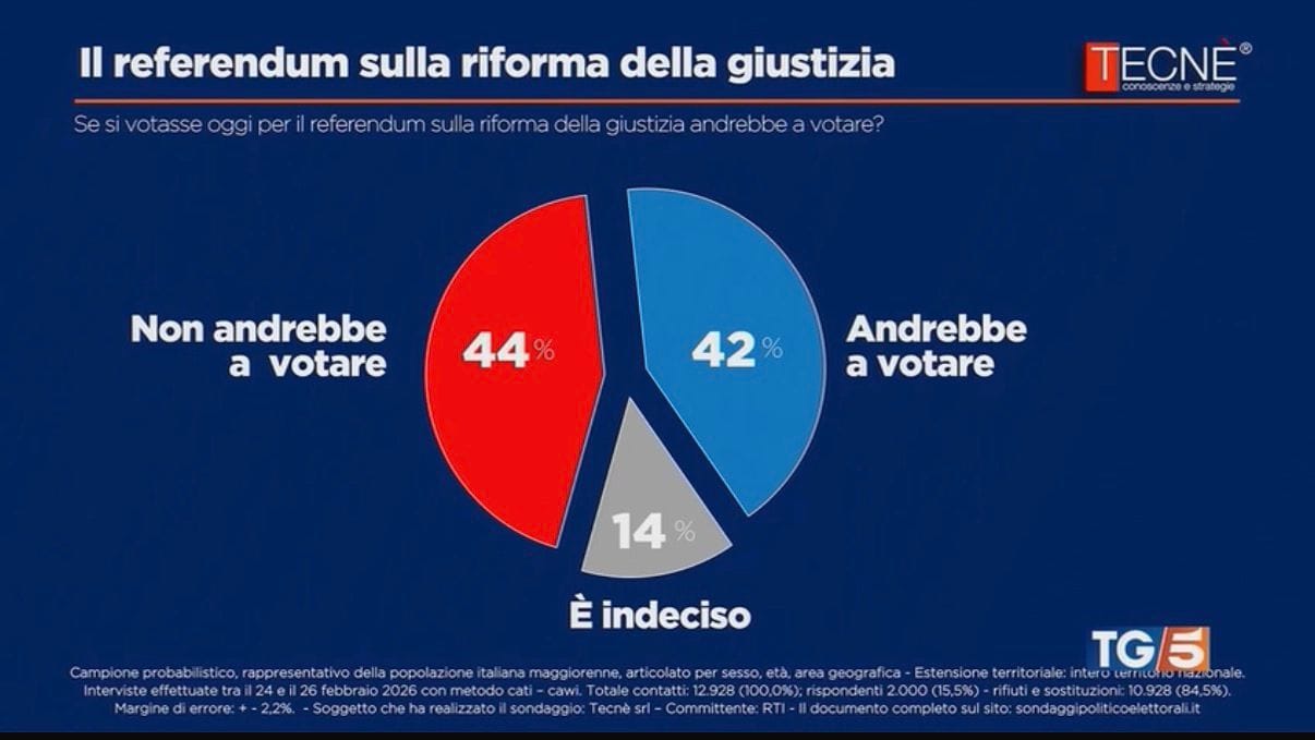 Secondo la rilevazione, il 44% degli intervistati dichiara che non andrebbe a votare, mentre il 42% afferma che si recherebbe alle urne. Un ulteriore 14% si definisce indeciso, segno di un clima ancora fluido attorno al tema della riforma.