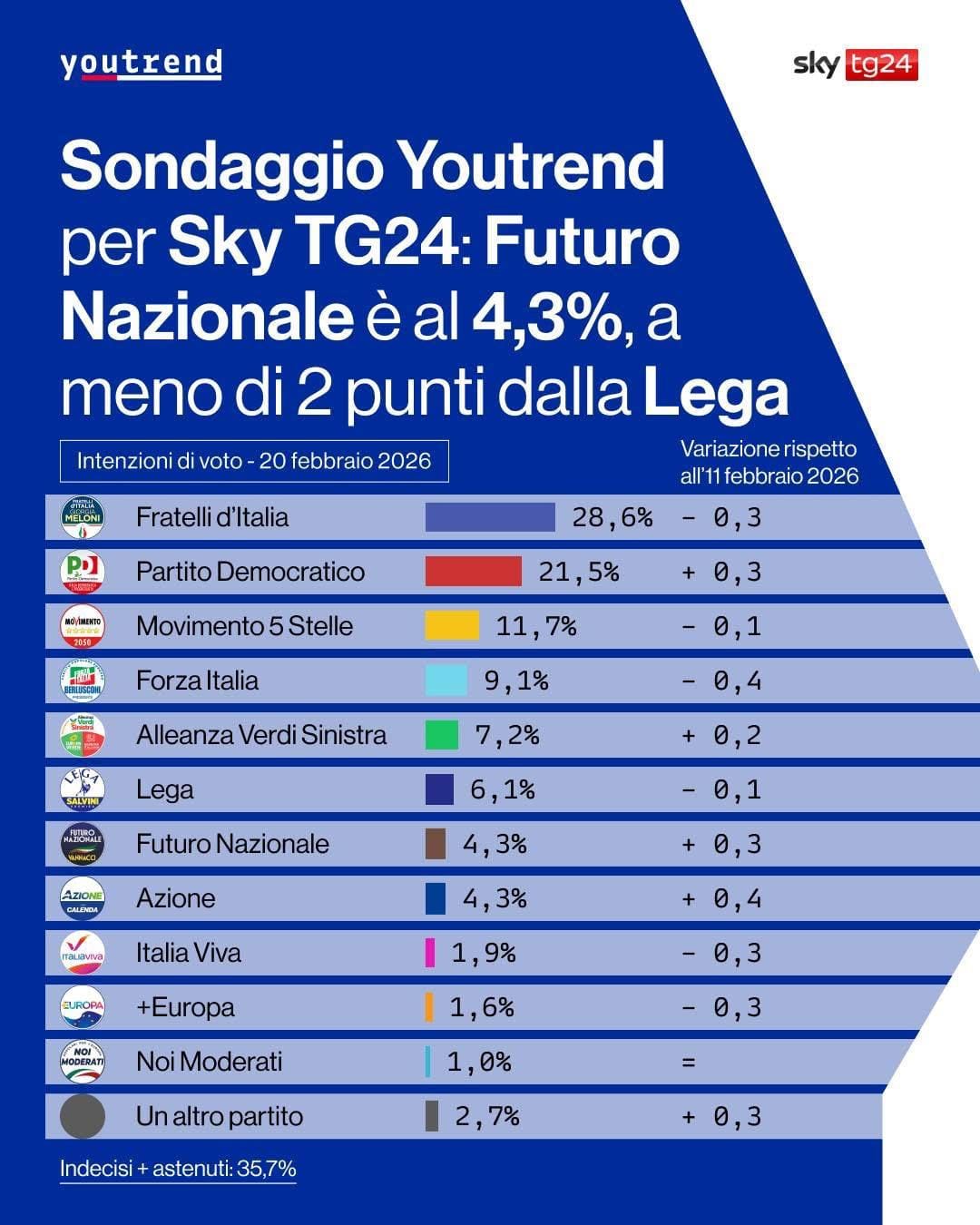 Il nuovo sondaggio realizzato da Youtrend per Sky TG24 conferma un quadro politico complessivamente stabile nei rapporti di forza tra i principali partiti, ma evidenzia movimenti significativi nelle aree intermedie e, soprattutto, una crescente competizione interna al centrodestra.