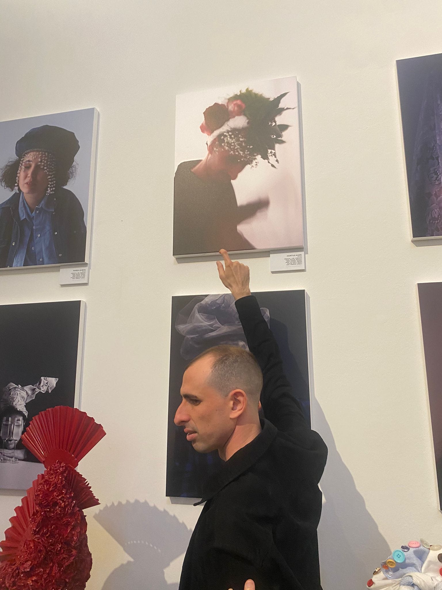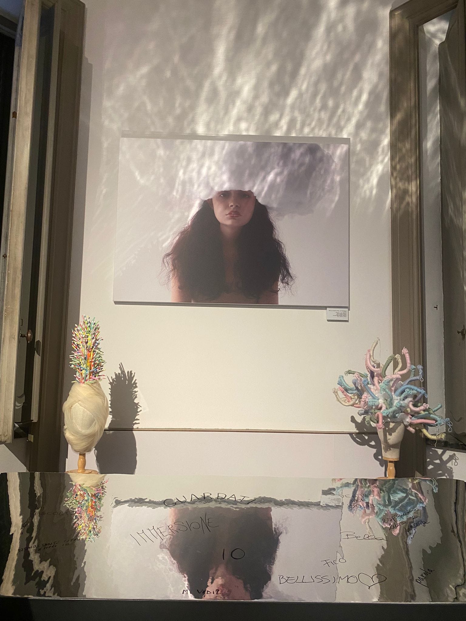 Nella Sala degli Arazzi della casa museo sono state disposte le opere degli artisti emergenti. Le pareti sono dipinte di un bianco candido e innocente e fanno da perfetta cornice alle opere affollate di colori. Lungo le due pareti corte della sala è collocata la stessa opera, con lo styling del curatore e artista Amatulli Ho la testa fra le nuvole, che ritrae la modella Aitalina Paduraru in un tripudio di bianco con un turbante di soffice cotone e, le labbra, contornate di rosso ferrarese che inchiodano l’occhio e commuovono dirigendo, poi, l’attenzione sullo sguardo profondo e indifeso della modella. I ritratti colpiscono il visitatore, sta poi alla sensibilità personale scegliere il preferito spaziando da foto mosse con turbanti di fiori come Hortus Animi, con lo styling di Nelly Terzic, che ritrae Riccardo Contino come se si stesse muovendo in un prato fiorito, alle foto in bianco e nero eredi dell’estetica del regista Wes Anderson, come si vede nell’immagine di Letizia Fico, dove viene ritratto Luca Fontana, con un turbante brillantinato, riflette appoggiato al tavolo, con gli occhi chiusi, davanti due flûte colmi di speranza.