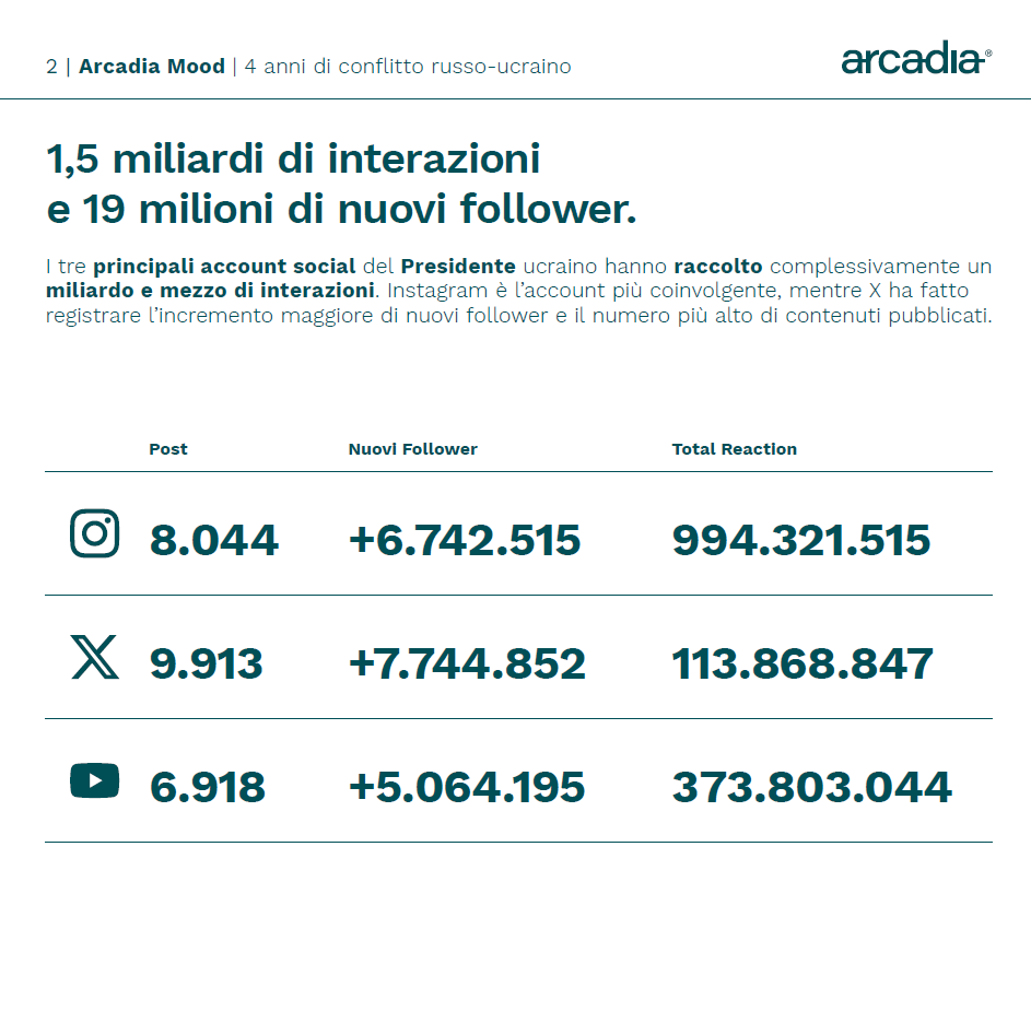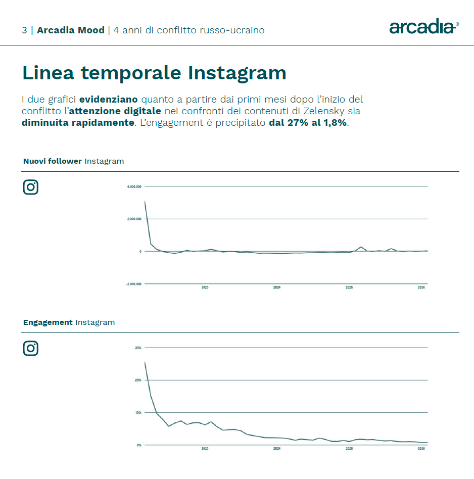 A quattro anni dall’inizio del conflitto tra Russia e Ucraina, l’attenzione digitale attorno ai contenuti del presidente ucraino Volodymyr Zelensky mostra segnali di progressivo affievolimento. È quanto emerge da un report di Arcadia che analizza l’andamento degli account social del leader ucraino dal 2022 al 2026.